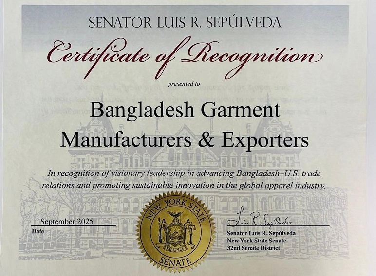 নিউইয়র্ক স্টেট সিনেট সার্টিফিকেট অব রিকগনিশন, যা স্বাক্ষর করেন সিনেটর লুইস আর. সেপুলভেদা (৩২তম সিনেট জেলা), বিজিএমইএ’র দূরদর্শী নেতৃত্ব এবং বাংলাদেশ–মার্কিন বাণিজ্য সম্পর্ক সুদৃঢ় করার পাশাপাশি বৈশ্বিক পোশাক খাতে টেকসই ও দায়িত্বশীল ব্যবসায়িক চর্চা প্রচারে অবদানের স্বীকৃতি দেয়। অনুষ্ঠানে বিজিএমইএ’র সভাপতি মাহমুদ হাসান খান উপস্থিত ছিলেন এবং সংগঠনের পক্ষ থেকে সম্মাননাটি গ্রহণ করেন।