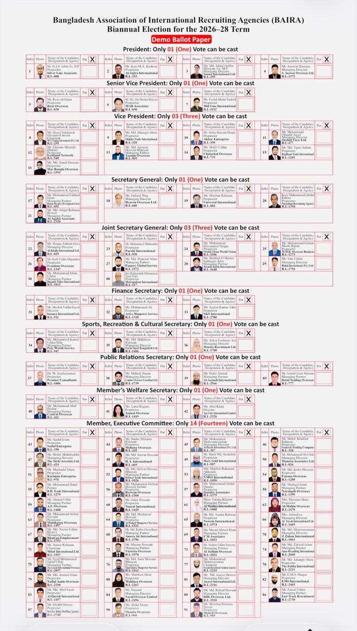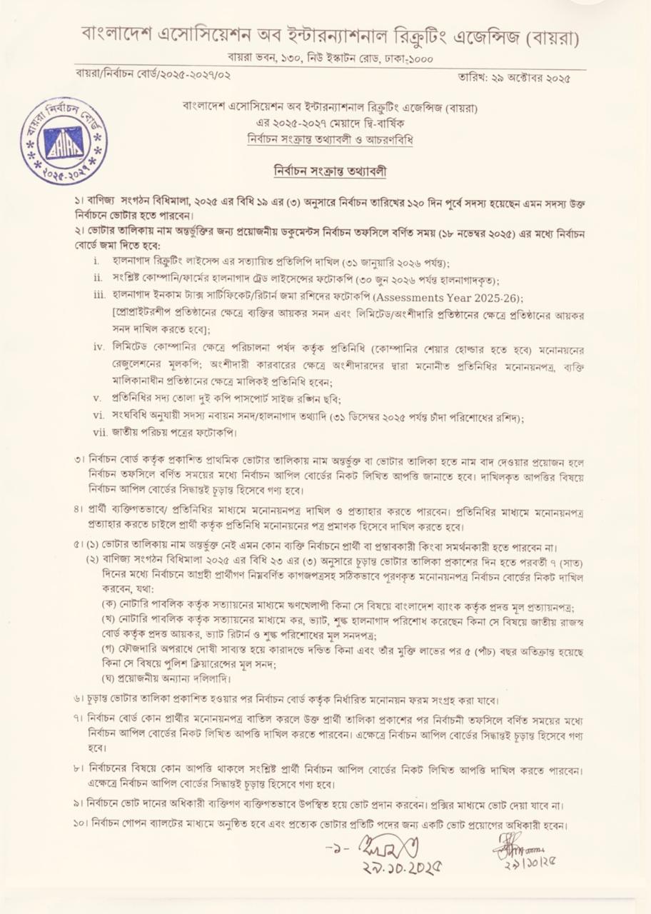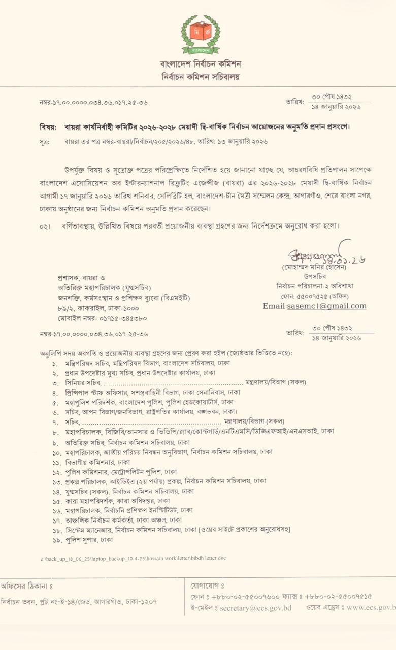 নির্ধারিত আচরণবিধি প্রতিপালন সাপেক্ষে বাংলাদেশ অ্যাসোসিয়েশন অব ইন্টারন্যাশনাল রিক্রুটিং এজেন্সির (বায়রা) ২০২৬-২০২৮ মেয়াদি কার্যনির্বাহী কমিটির দ্বি-বার্ষিক নির্বাচন আয়োজনের অনুমতি দিয়েছে নির্বাচন কমিশন (ইসি)। বুধবার (১৪ জানুয়ারি) ইসির উপসচিব মোহাম্মদ মনির হোসেনের সই করা এ সংক্রান্ত এক চিঠি থেকে এ তথ্য জানা গেছে। জনশক্তি, কর্মসংস্থান ও প্রশিক্ষণ ব্যুরো (বিএমইটি) অতিরিক্ত মহাপরিচালক (যুগ্মসচিব) মো. আশরাফ হোসেন তথা বায়রার প্রশাসককে এ চিঠি দেওয়া হয়েছে।