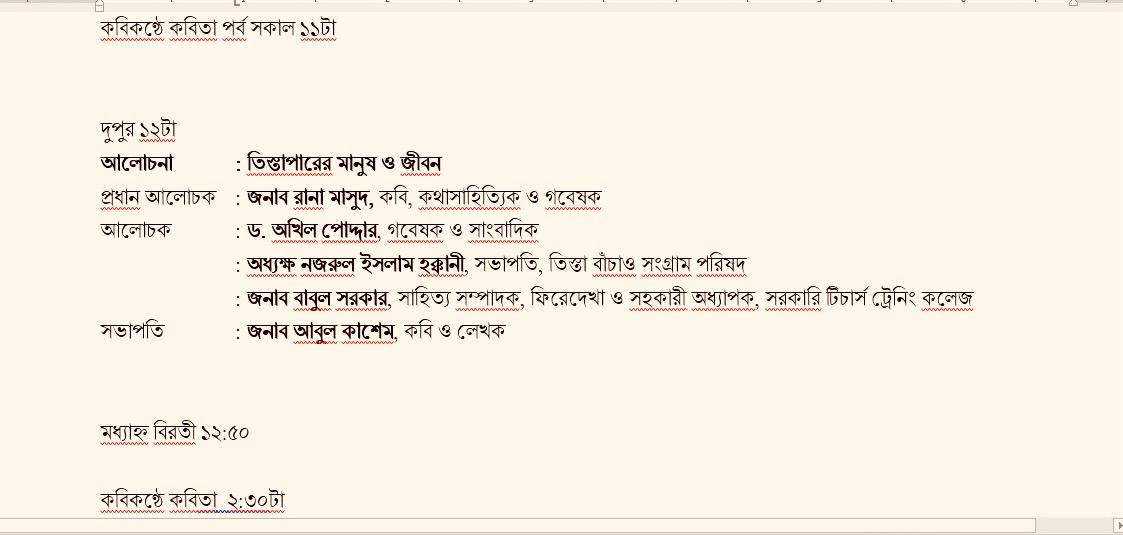 বেলা বাড়ার সাথে সাথে তিস্তার পাড় মুখরিত হবে স্বরচিত কবিতার ছন্দে। সকাল ১১টায় কবিকণ্ঠে কবিতা পাঠের আসরে বিভিন্ন প্রজন্মের কবিরা তাঁদের হৃদয়ের রক্তক্ষরণ আর প্রেমের পঙ্ক্তিমালা পাঠ করবেন। রোদের তেজ বাড়লে দুপুর ১২টায় শুরু হবে এক অন্যরকম সংলাপ— ‘তিস্তাপারের মানুষ ও জীবন’। এই পর্বে প্রধান আলোচক হিসেবে তিস্তা নদীকেন্দ্রিক জীবনদর্শন ও সংস্কৃতির বয়ান তুলে ধরবেন বিশিষ্ট কবি, কথাসাহিত্যিক ও গবেষক রানা মাসুদ। তাঁর সাথে আলোচনায় যোগ দেবেন গবেষক ও সাংবাদিক ড. অখিল পোদ্দার এবং কবি ও শিক্ষক মারুফ হোসেন মাহবুব। তাঁদের আলোচনায় ফুটে উঠবে কীভাবে নদী ভাঙনের হাহাকার আর চরের মানুষের টিকে থাকার লড়াই আগামীর সাহিত্যের মূল উপজীব্য হয়ে উঠতে পারে।