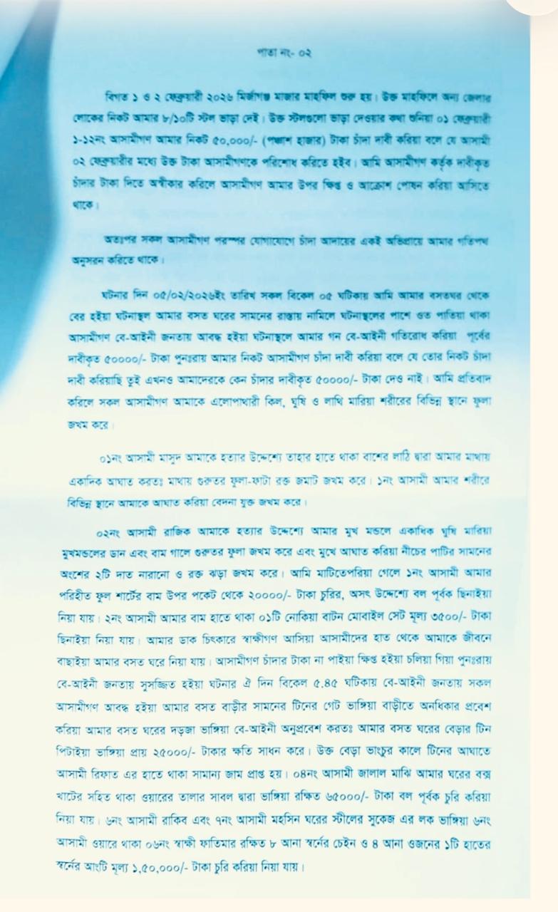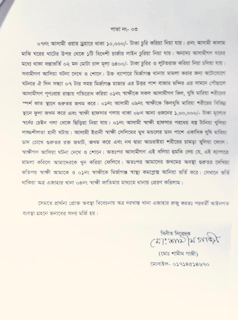 অভিযোগে আরও বলা হয়, পরে সন্ধ্যা সাড়ে ৫টার দিকে অভিযুক্তরা আবার দলবদ্ধ হয়ে শামীম গাজীর বাড়িতে হামলা চালায়। টিনের গেট ও দরজা ভেঙে ঘরে ঢুকে বেড়া ভাঙচুর করে প্রায় ২৫ হাজার টাকার ক্ষতি করে। পাশাপাশি ঘরের আলমারি ও সুকেস ভেঙে ৬৫ হাজার টাকা নগদ এবং প্রায় দেড় লাখ টাকা মূল্যের স্বর্ণালঙ্কার লুট করে নিয়ে যায়।