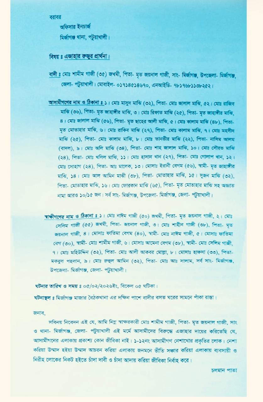 পটুয়াখালীর মির্জাগঞ্জে ইয়ারউদ্দিন খলিফা (র) এর মাজারের মাহফিল উপলক্ষে স্টল ভাড়া দেওয়াকে কেন্দ্র করে চাঁদা না পেয়ে এক ব্যবসায়ীর ওপর হামলা, লুটপাট ও বসতঘরে ভাঙচুরের অভিযোগ উঠেছে উপজেলা ছাত্রদলের সহ- সভাপতি রাজিব মাঝি ও তার মা সদর ইউনিয়ান বিএনপির সহ- সভাপতি ইরানি বেগমের বিরুদ্ধে। এ ঘটনায় অন্তত তিনজন আহত হয়েছেন। আহত ব্যবসায়ী মো. শামীম গাজী মির্জাগঞ্জ থানায় ১৬ জনের নাম উল্লেখসহ অজ্ঞাত আরও ১০–১৫ জনের বিরুদ্ধে মামলা দায়ের করেছেন। অভিযুক্তরা জেলা বিএনপি সভাপতির অনুসারি বলে একাধিক সূত্র নিশ্চিত করেছে।
